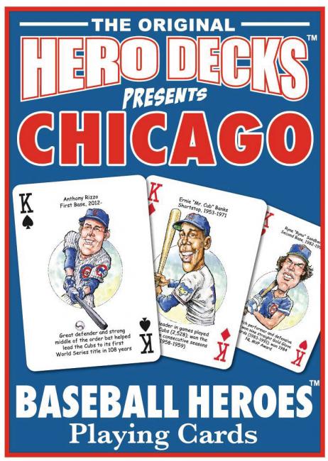 The Chicago North-side Hero Deck playing cards for Chicago Cubs fans feature fifty-two of the greatest players by position and era in Chicago Cubs baseball history. Thoughtfully organized by position using baseball numerology, the face of each playing card is colorfully illustrated with a different hero ... this deck is sure to be a HOME RUN with Cubs fans of all ages!