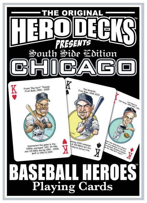 The Chicago Southside Hero Deck playing cards for Chicago White Sox fans feature fifty-two of the greatest players by position and era in Chicago White Sox baseball history. Thoughtfully organized by position using baseball numerology, the face of each playing card is colorfully illustrated with a different hero ... this deck is sure to be a HOME RUN with White Sox fans of all ages!