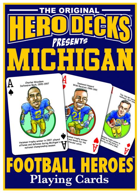 The Michigan Football Hero Deck playing cards for Michigan Wolverines fans feature fifty-two of the greatest players by position and era in Michigan Wolverines football history. The face of each playing card is colorfully illustrated with a different hero ... this deck is sure to score a TOUCHDOWN with Wolverines fans of all ages!
