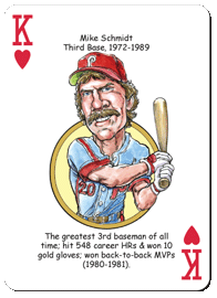 The Philadelphia Baseball Hero Deck playing cards for Philadelphia Phillies fans feature fifty-two of the greatest players by position and era in Philadelphia Phillies baseball history. Thoughtfully organized by position using baseball numerology, the face of each playing card is colorfully illustrated with a different hero ... this deck is sure to be a HOME RUN with Phillies fans of all ages!