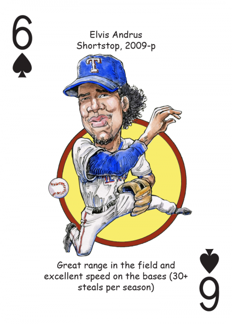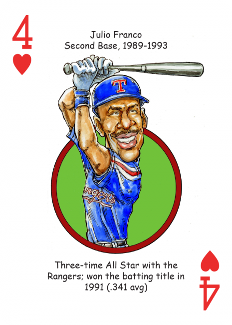 The Texas Baseball Hero Deck playing cards for Texas Rangers fans feature fifty-two of the greatest players by position and era in Texas Rangers baseball history. Thoughtfully organized by position using baseball numerology, the face of each playing card is colorfully illustrated with a different hero ... this deck is sure to hit a HOME RUN with Rangers fans of all ages!