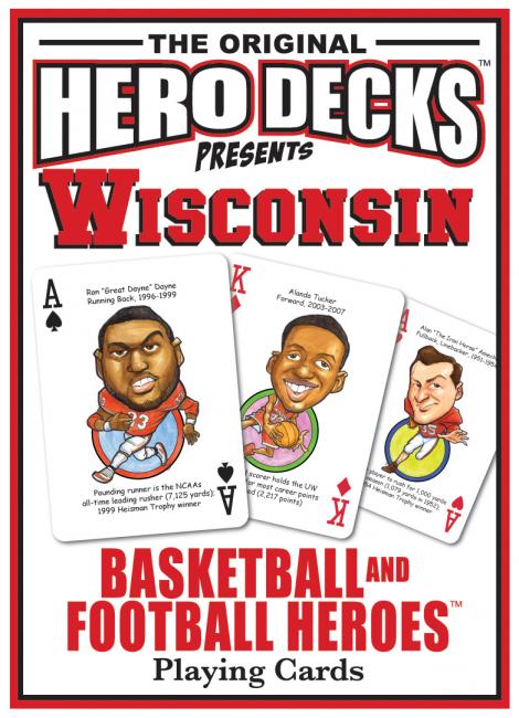 The Wisconsin Sports Hero Deck playing cards for Wisconsin Badger fans feature fifty-two of the greatest players by position and era in Wisconsin Badgers football and basketball history. The face of each playing card is colorfully illustrated with a different hero ... this deck is sure to SCORE with Badger fans of all ages!